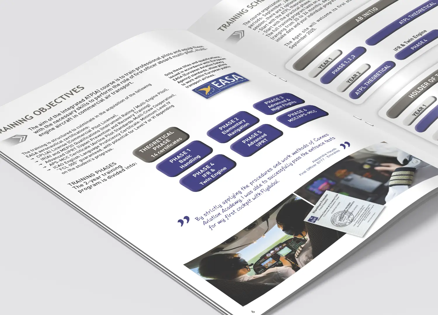 Qui dit centre de formation, dit brochures d’information ! Depuis plus de 10 ans, je suis les évolutions des formations des pilotes en les mettant à jour et en en créant de nouvelles. Si l’équipe de Mathieu Di Costanzo me fait confiance depuis toutes ces années c’est qu’elle sait que je vais hiérarchiser les informations, créer des niveaux de lecture, animer les pages par des illustrations, donner un style graphique reconnaissable.