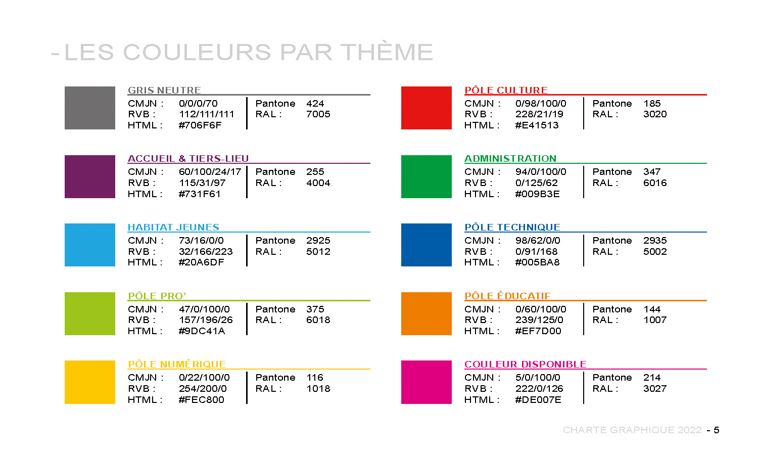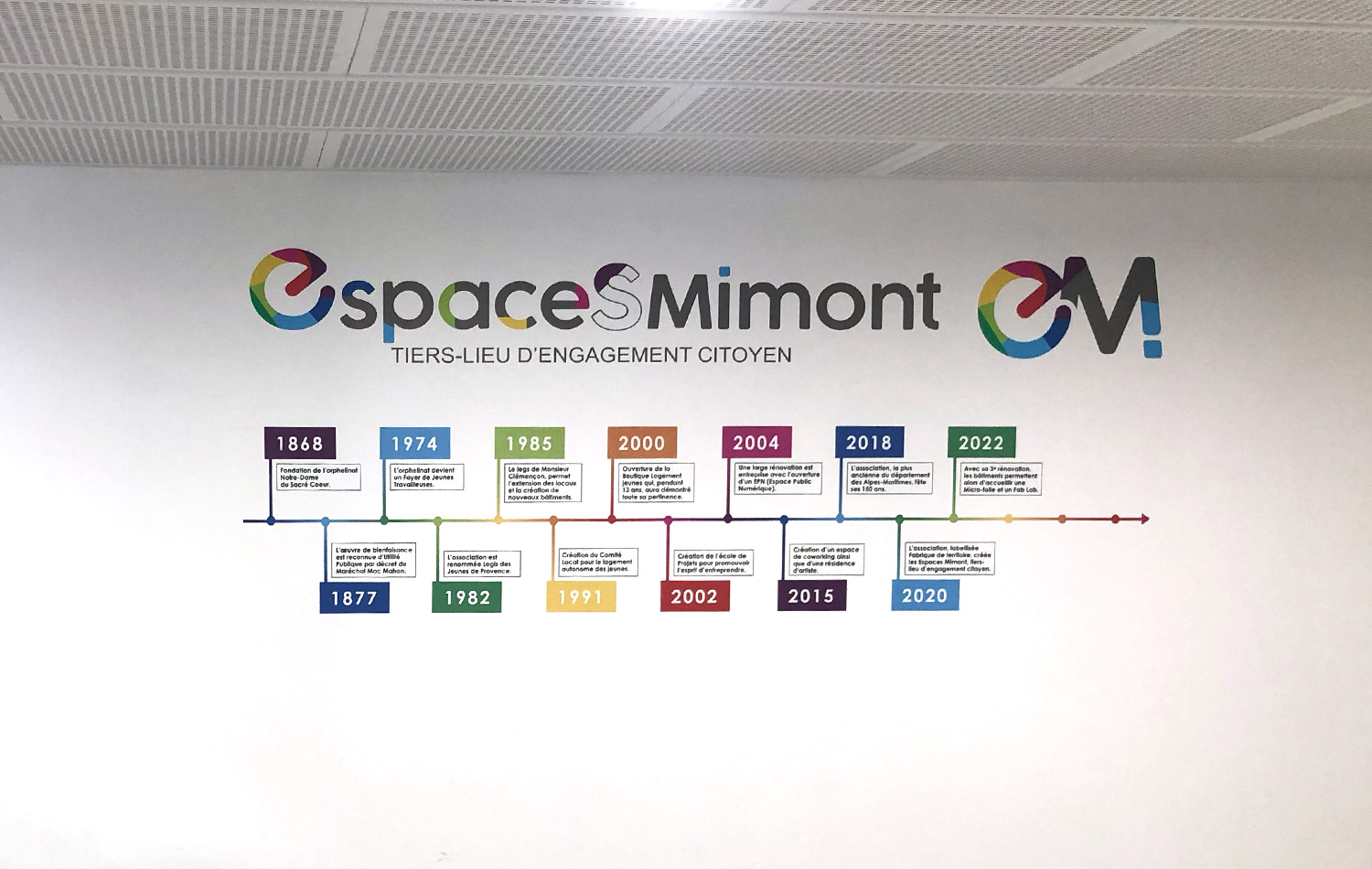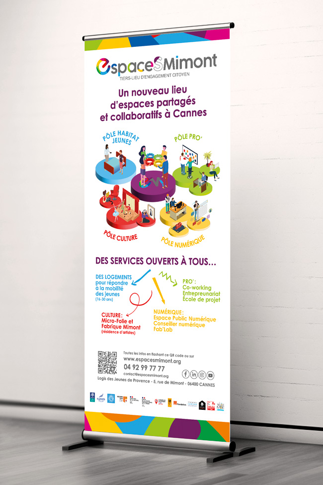 Avec l’équipe du développement et des jeunes résidents, nous avons pu travailler sur des pistes graphiques puis finaliser le principe de la communication des « Espaces Mimont ». Des thèmes « pigmentés » associés à une communication colorée font aujourd’hui vivre ce tiers-lieu qui accueille un large public en proposant des animations citoyennes et participatives.